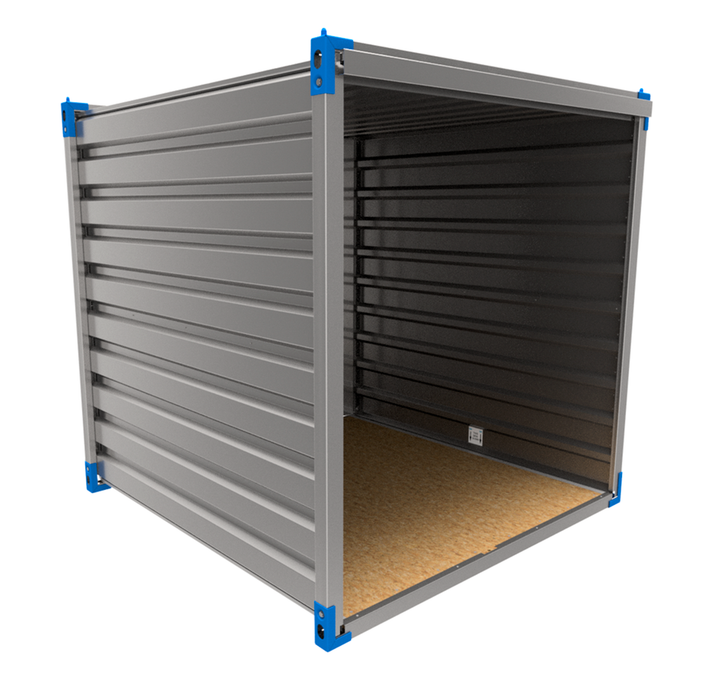 Sammenklappelig container til materialer uden døre – med helt åben langside.