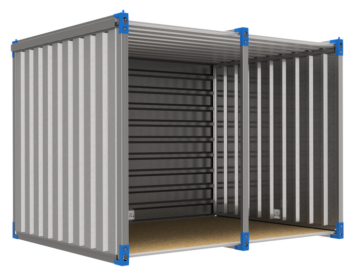 Sammenklappelig container til materialer uden døre – med helt åben langside.