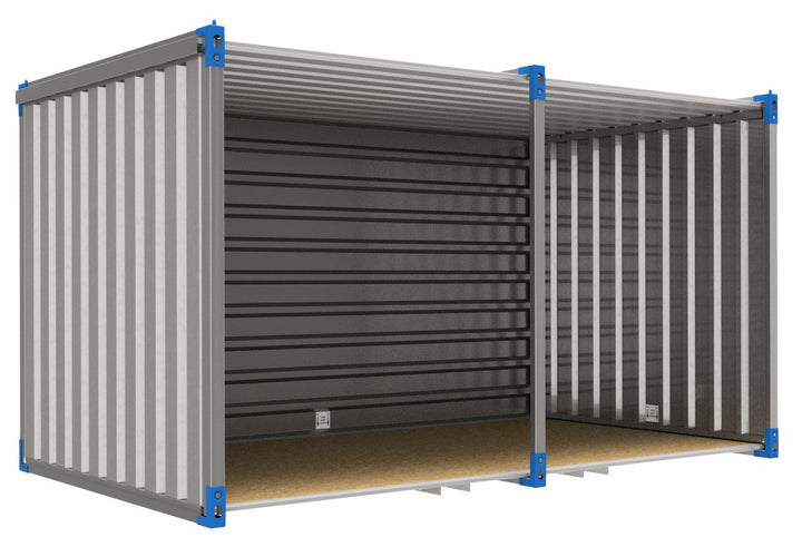 Sammenklappelig container til materialer uden døre – med helt åben langside.